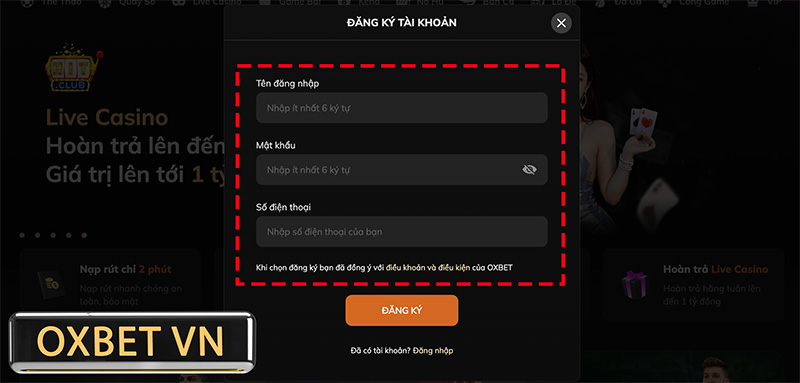 Điền thông tin đăng ký tài khoản Oxbet