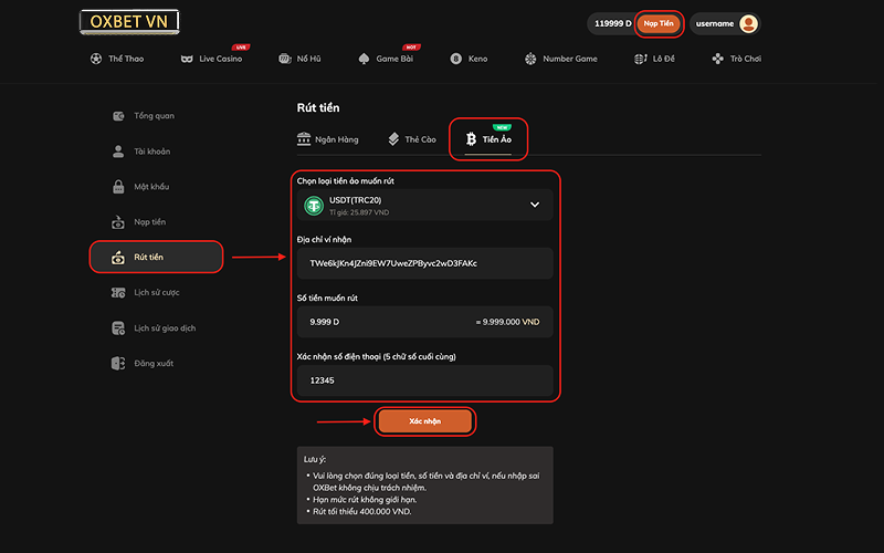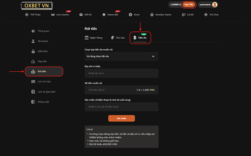 - Bước 1: Đăng nhập tài khoản OXBET → vào mục RÚT TIỀN → chọn phương thức TIỀN ẢO