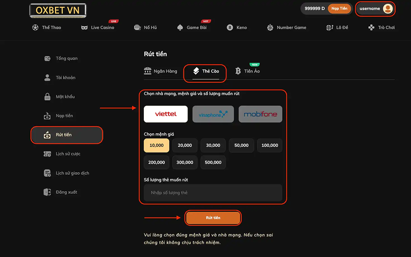 Nếu bạn không có tài khoản ngân hàng hoặc ví tiền ảo, hãy chọn rút tiền bằng thẻ cào, tiện lợi và nhanh chóng. Thao tác rút tiền bằng thẻ cào như sau: